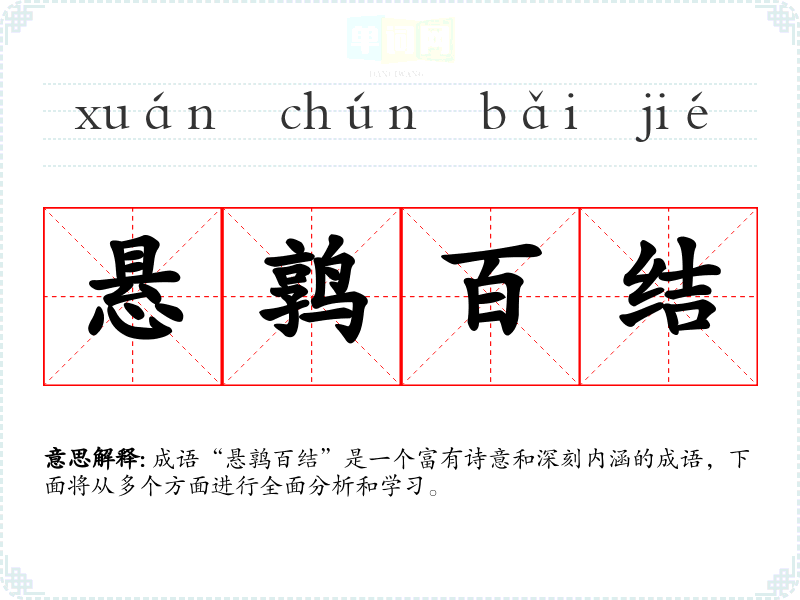 在文学作品中,该成语常被用来描绘复杂的情感关系或局势。如在小说中,人物面对错综复杂的关系时,可以使用“悬鹑百结”来形容其内心的纠结。在日常对话中,当谈到某个问题复杂、不易解决时,也可以用此成语表达。