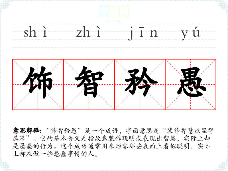 “饰智矜愚”是一个成语,字面意思是“装饰智慧以显得愚笨”。它的基本含义是指故意装作聪明或表现出智慧,实际上却是愚蠢的行为。这个成语通常用来形容那些表面上看似聪明,实际上却在做一些愚蠢事情的人。