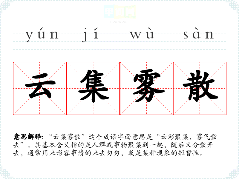 “云集雾散”这个成语字面意思是“云彩聚集,雾气散去”。其基本含义指的是人群或事物聚集到一起,随后又分散开去,通常用来形容事情的来去匆匆,或是某种现象的短暂性。