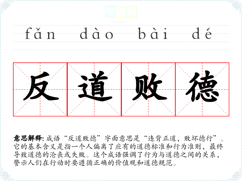 成语“反道败德”字面意思是“违背正道,败坏德行”。它的基本含义是指一个人偏离了应有的道德标准和行为准则,最终导致道德的沦丧或失败。这个成语强调了行为与道德之间的关系,警示人们在行动时要遵循正确的价值观和道德规范。