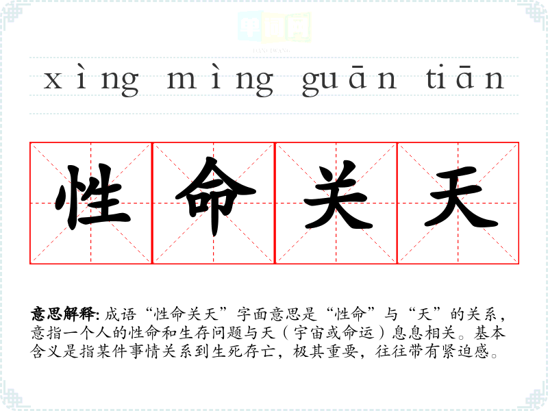 成语“性命关天”字面意思是“性命”与“天”的关系,意指一个人的性命和生存问题与天(宇宙或命运)息息相关。基本含义是指某件事情关系到生死存亡,极其重要,往往带有紧迫感。