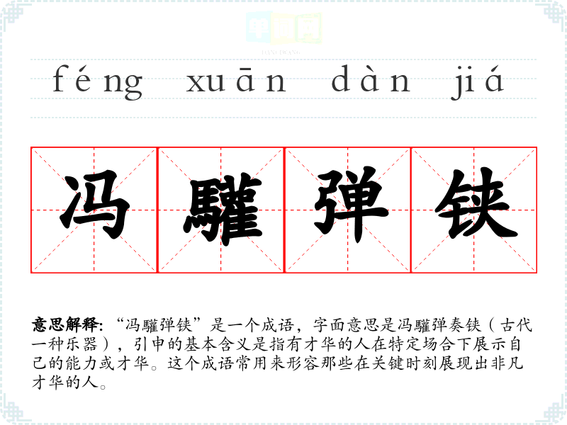 “冯驩弹铗”是一个成语,字面意思是冯驩弹奏铗(古代一种乐器),引申的基本含义是指有才华的人在特定场合下展示自己的能力或才华。这个成语常用来形容那些在关键时刻展现出非凡才华的人。