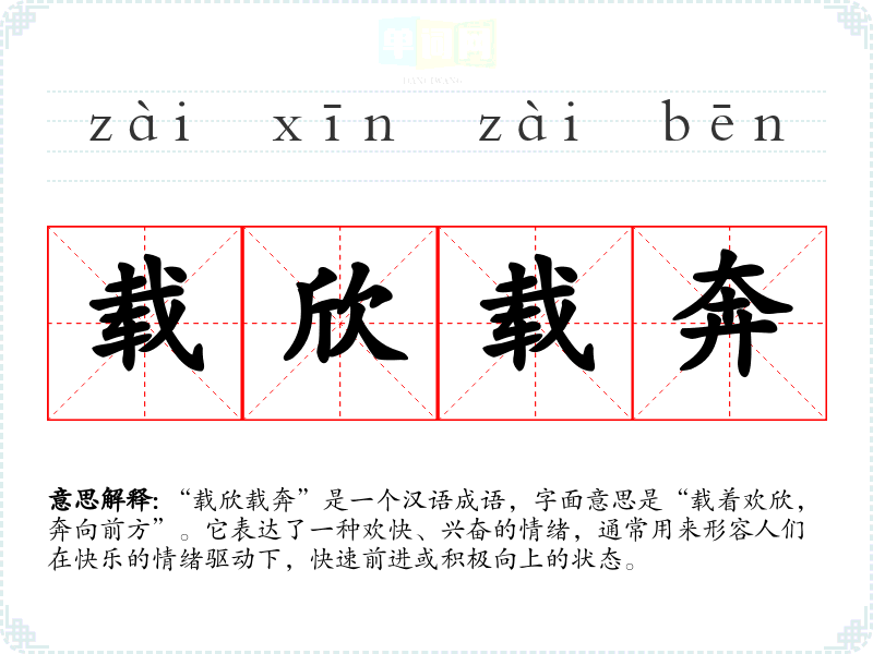 “载欣载奔”是一个汉语成语,字面意思是“载着欢欣,奔向前方”。它表达了一种欢快、兴奋的情绪,通常用来形容人们在快乐的情绪驱动下,快速前进或积极向上的状态。