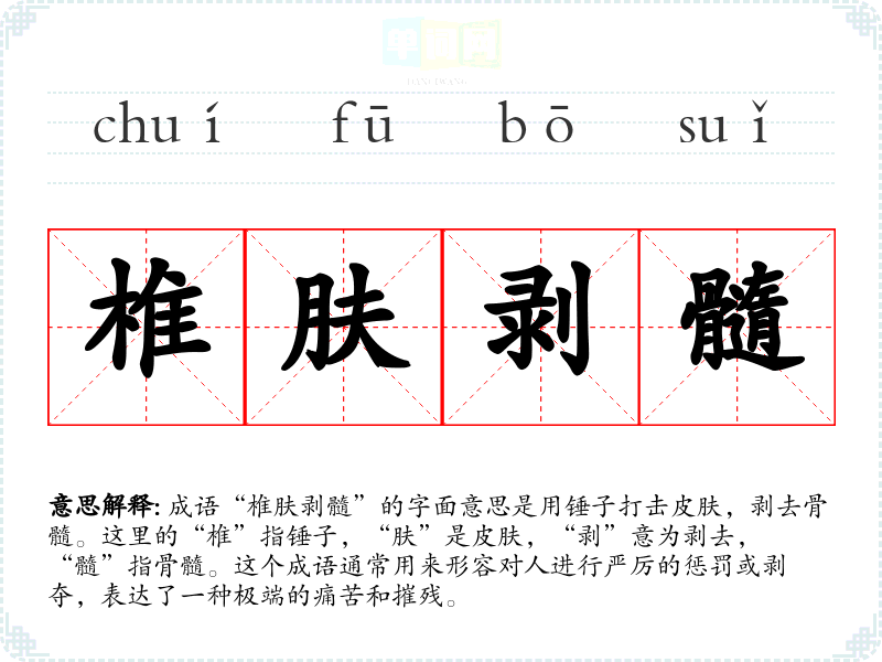 成语“椎肤剥髓”的字面意思是用锤子打击皮肤,剥去骨髓。这里的“椎”指锤子,“肤”是皮肤,“剥”意为剥去,“髓”指骨髓。这个成语通常用来形容对人进行严厉的惩罚或剥夺,表达了一种极端的痛苦和摧残。