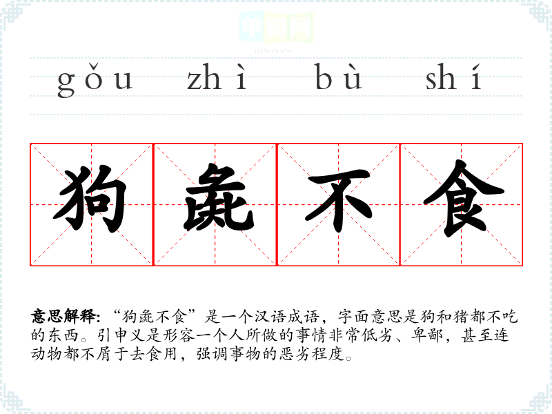 “狗彘不食”是一个汉语成语,字面意思是狗和猪都不吃的东西。引申义是形容一个人所做的事情非常低劣、卑鄙,甚至连动物都不屑于去食用,强调事物的恶劣程度。