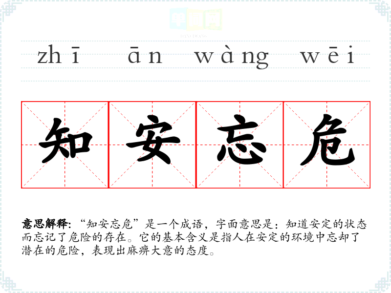 “知安忘危”是一个成语,字面意思是:知道安定的状态而忘记了危险的存在。它的基本含义是指人在安定的环境中忘却了潜在的危险,表现出麻痹大意的态度。