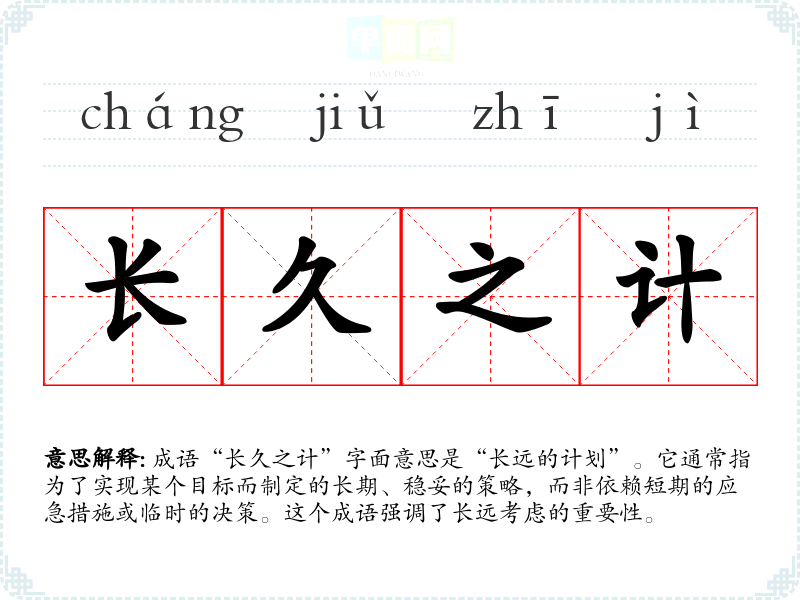 成语“长久之计”字面意思是“长远的计划”。它通常指为了实现某个目标而制定的长期、稳妥的策略,而非依赖短期的应急措施或临时的决策。这个成语强调了长远考虑的重要性。