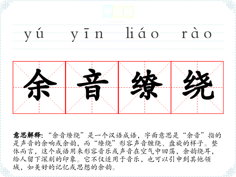 “余音缭绕”是一个汉语成语,字面意思是“余音”指的是声音的余响或余韵,而“缭绕”形容声音缠绕、盘旋的样子。整体而言,这个成语用来形容音乐或声音在空气中回荡,余韵绕耳,给人留下深刻的印象。它不仅适用于音乐,也可以引申到其他领域,如美好的记忆或思想的余韵。