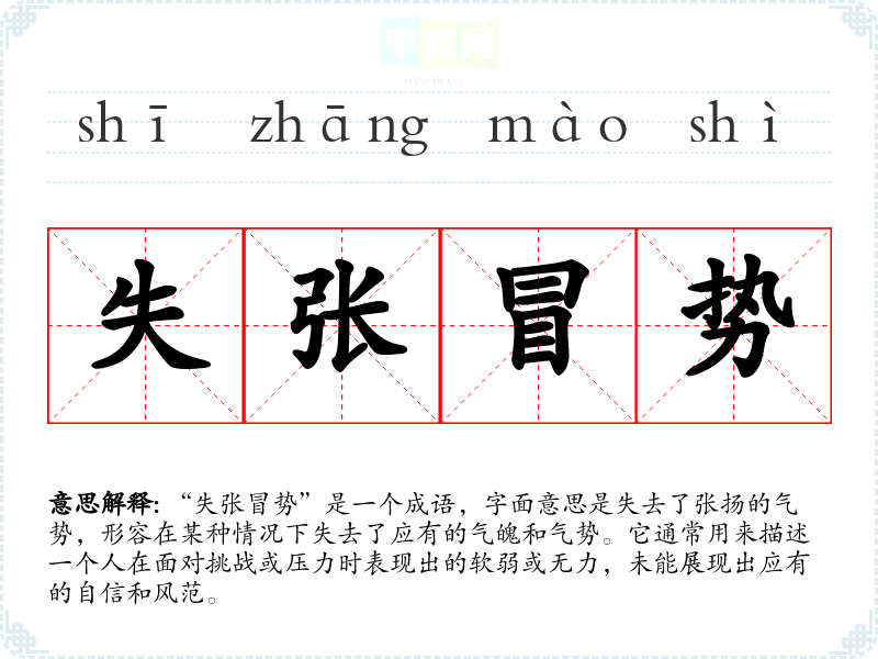 - 反义成语:气宇轩昂、斗志昂扬,表示一种积极向上的状态,与失张冒势形成鲜明对比。