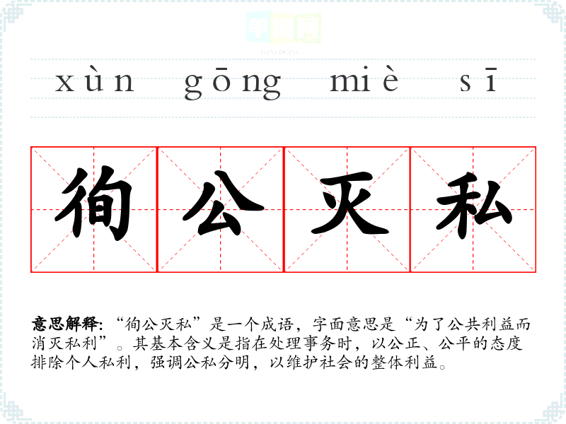 “徇公灭私”源自**古代的政治和道德观念,强调为公而忘私的精神。在历史上,许多政治家和士人倡导这种精神,尤其是在儒家思想的影响下,强调个人应将公共利益置于个人利益之上。虽然没有确切的文学出处,但这一理念在《论语》和其他古典文献中有着广泛的体现。