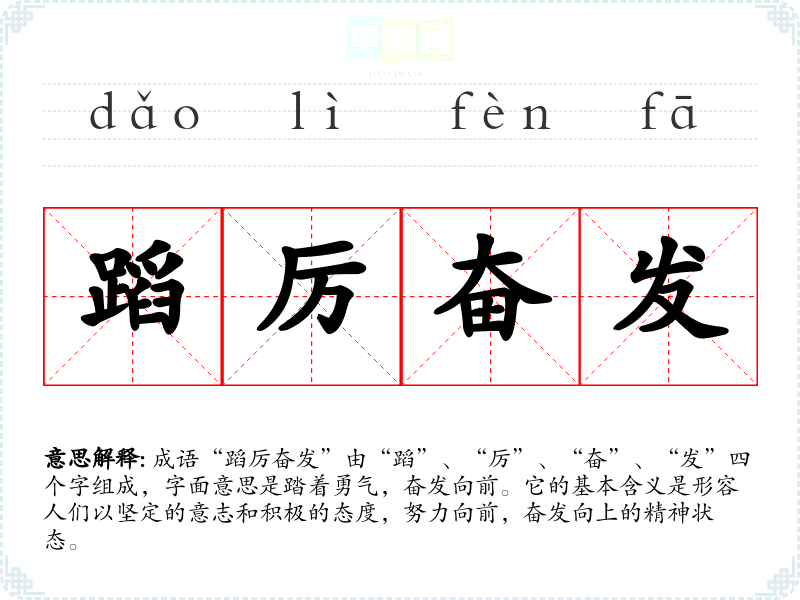 成语“蹈厉奋发”由“蹈”、“厉”、“奋”、“发”四个字组成,字面意思是踏着勇气,奋发向前。它的基本含义是形容人们以坚定的意志和积极的态度,努力向前,奋发向上的精神状态。