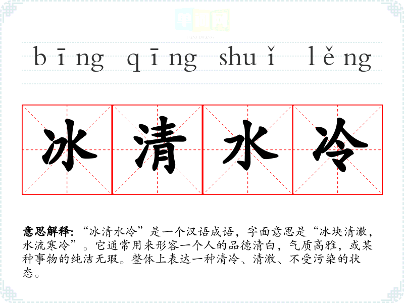“冰清水冷”是一个汉语成语,字面意思是“冰块清澈,水流寒冷”。它通常用来形容一个人的品德清白,气质高雅,或某种事物的纯洁无瑕。整体上表达一种清冷、清澈、不受污染的状态。