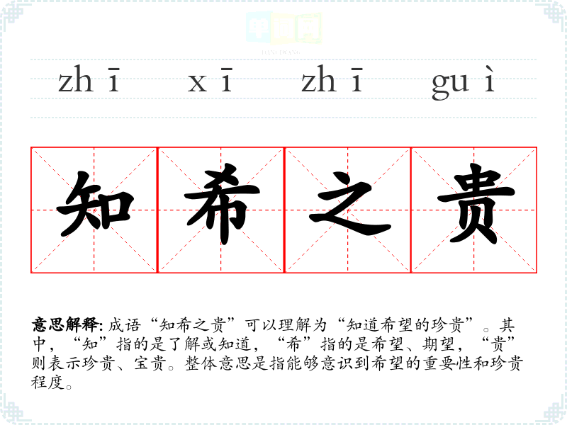 “知希之贵”并不是一个广为人知的成语,可能是对某些古文或哲理的提炼。它的构造与“知足常乐”等成语类似,表达了一种对希望和未来的珍视。在历史背景上,这种表达方式常见于古代文人的诗词和哲学思想中,强调对希望的把握与重视。