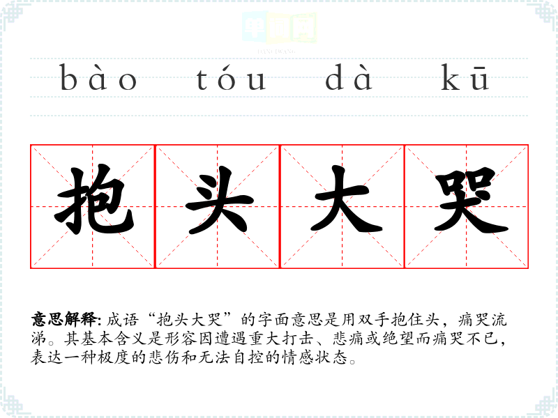 成语“抱头大哭”的字面意思是用双手抱住头,痛哭流涕。其基本含义是形容因遭遇重大打击、悲痛或绝望而痛哭不已,表达一种极度的悲伤和无法自控的情感状态。
