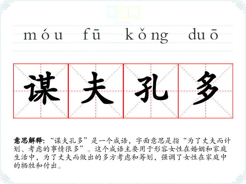 “谋夫孔多”是一个成语,字面意思是指“为了丈夫而计划、考虑的事情很多”。这个成语主要用于形容女性在婚姻和家庭生活中,为了丈夫而做出的多方考虑和筹划,强调了女性在家庭中的牺牲和付出。