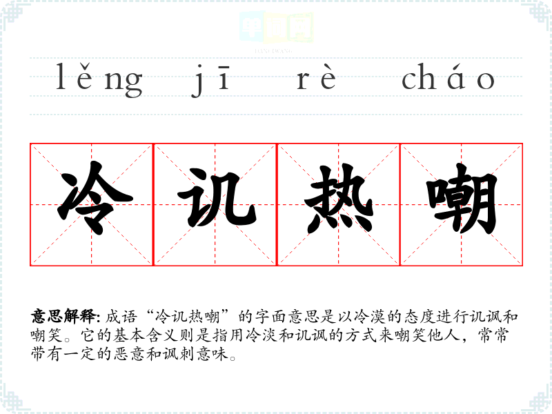 成语“冷讥热嘲”的字面意思是以冷漠的态度进行讥讽和嘲笑。它的基本含义则是指用冷淡和讥讽的方式来嘲笑他人,常常带有一定的恶意和讽刺意味。