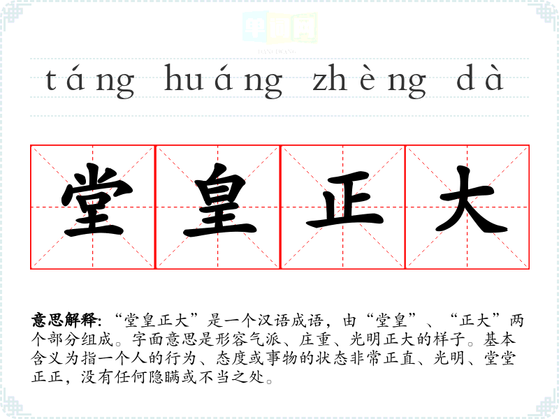 “堂皇正大”是一个汉语成语,由“堂皇”、“正大”两个部分组成。字面意思是形容气派、庄重、光明正大的样子。基本含义为指一个人的行为、态度或事物的状态非常正直、光明、堂堂正正,没有任何隐瞒或不当之处。