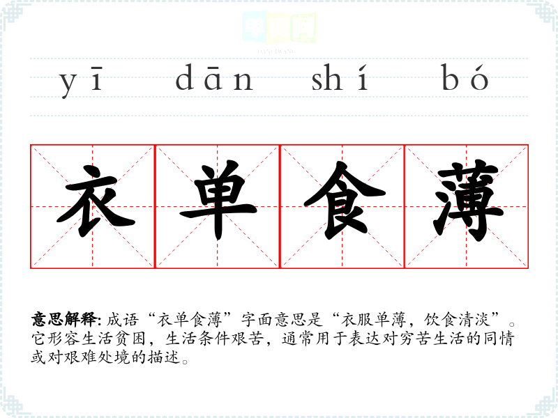 成语“衣单食”字面意思是“衣服单,饮食清淡”。它形容生活贫困,生活条件艰苦,通常用于表达对穷苦生活的同情或对艰难处境的描述。