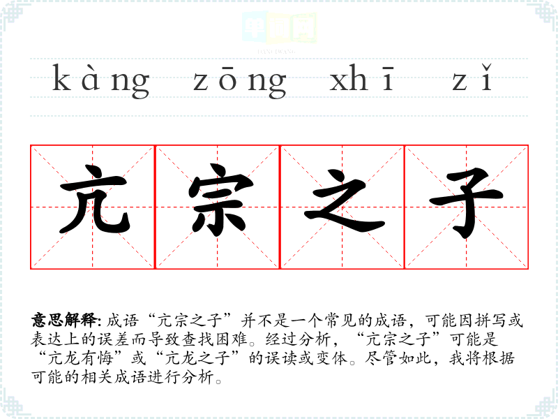 成语“亢宗之子”并不是一个常见的成语,可能因拼写或表达上的误差而导致查找困难。经过分析,“亢宗之子”可能是“亢龙有悔”或“亢龙之子”的误读或变体。尽管如此,我将根据可能的相关成语进行分析。