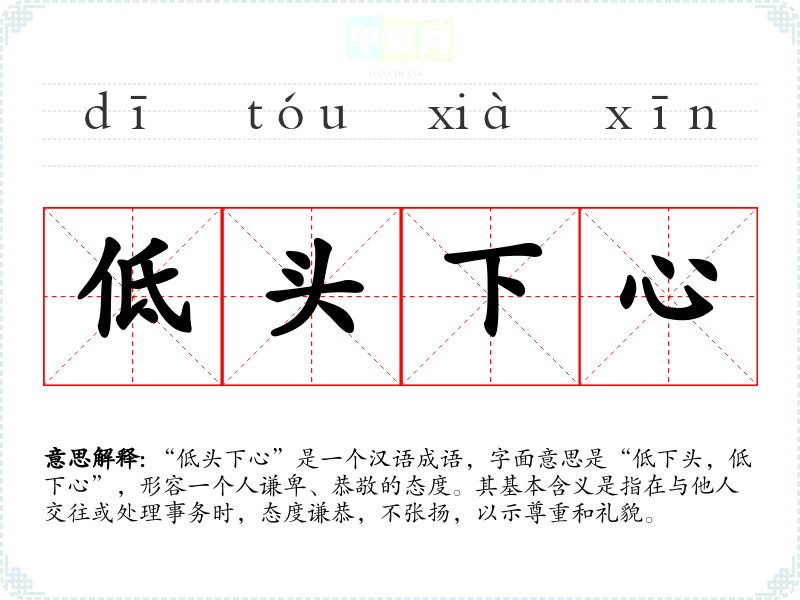 “低头下心”是一个汉语成语,字面意思是“低下头,低下心”,形容一个人谦卑、恭敬的态度。其基本含义是指在与他人交往或处理事务时,态度谦恭,不张扬,以示尊重和礼貌。