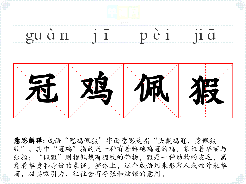 成语“冠鸡佩猳”字面意思是指“头戴鸡冠,身佩猳纹”。其中“冠鸡”指的是一种有着鲜艳鸡冠的鸡,象征着华丽与张扬;“佩猳”则指佩戴有猳纹的饰物,猳是一种动物的皮毛,寓意着华贵和身份的象征。整体上,这个成语用来形容人或物外表华丽,极具吸引力,往往含有夸张和炫耀的意图。