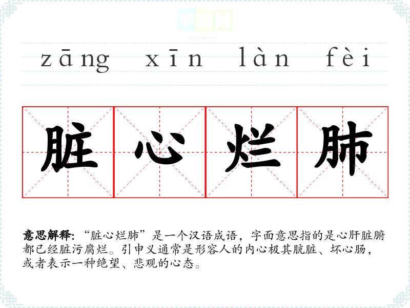 “脏心烂肺”是一个汉语成语,字面意思指的是心肝脏腑都已经脏污腐烂。引申义通常是形容人的内心极其肮脏、坏心肠,或者表示一种绝望、悲观的心态。