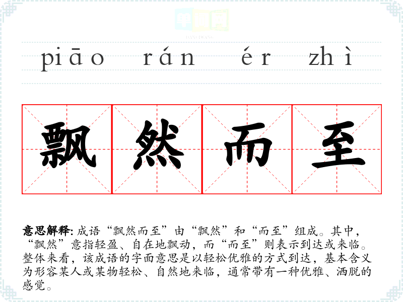 成语“飘然而至”由“飘然”和“而至”组成。其中,“飘然”意指轻盈、自在地飘动,而“而至”则表示到达或来临。整体来看,该成语的字面意思是以轻松优雅的方式到达,基本含义为形容某人或某物轻松、自然地来临,通常带有一种优雅、洒脱的感觉。