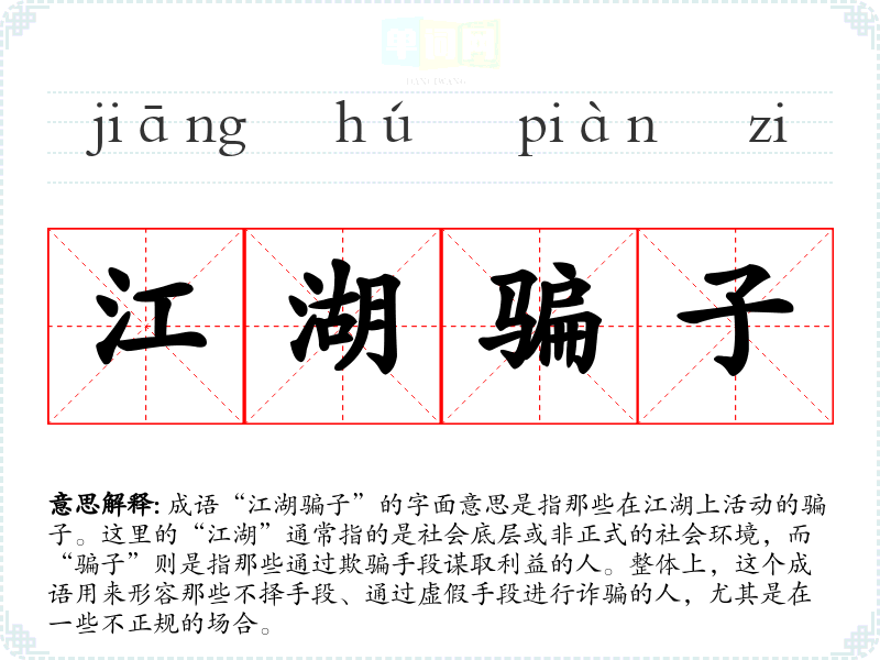 成语“江湖骗子”的字面意思是指那些在江湖上活动的骗子。这里的“江湖”通常指的是社会底层或非正式的社会环境,而“骗子”则是指那些通过欺骗手段谋取利益的人。整体上,这个成语用来形容那些不择手段、通过虚假手段进行诈骗的人,尤其是在一些不正规的场合。