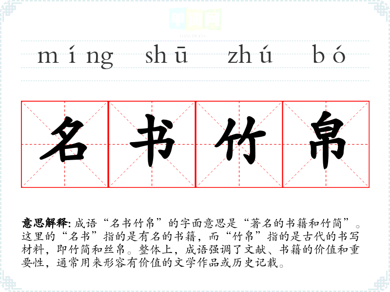 成语“名书竹帛”的字面意思是“著名的书籍和竹简”。这里的“名书”指的是有名的书籍,而“竹帛”指的是古代的书写材料,即竹简和丝帛。整体上,成语强调了文献、书籍的价值和重要性,通常用来形容有价值的文学作品或历史记载。