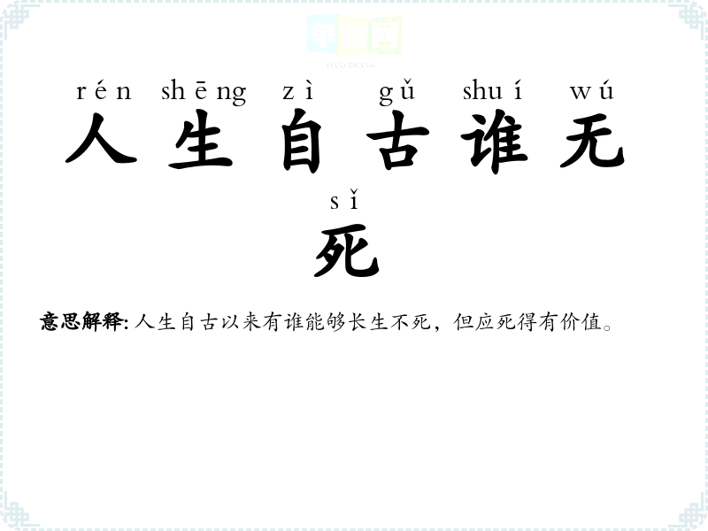 | 人生自古谁无死 | 人生自古以来有谁能够长生不死,但应死得有价值。 |