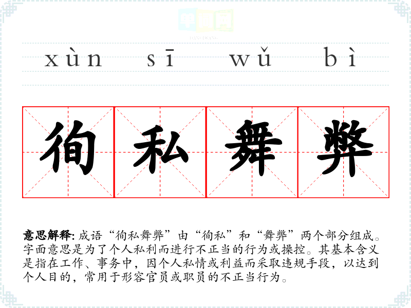 成语“徇私舞弊”由“徇私”和“舞弊”两个部分组成。字面意思是为了****而进行不正当的行为或操控。其基本含义是指在工作、事务中,因个人私情或利益而采取违规手段,以达到个人目的,常用于形容官员或职员的不正当行为。