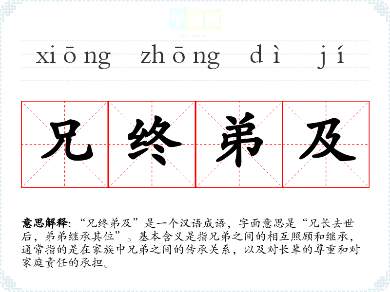 “兄终弟及”是一个汉语成语,字面意思是“兄长去世后,弟弟继承其位”。基本含义是指兄弟之间的相互照顾和继承,通常指的是在家族中兄弟之间的传承关系,以及对长辈的尊重和对家庭责任的承担。