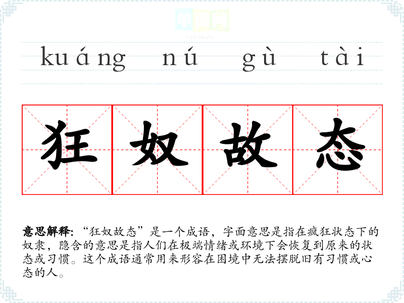 “狂奴故态”是一个成语,字面意思是指在疯狂状态下的奴隶,隐含的意思是指人们在极端情绪或环境下会恢复到原来的状态或惯。这个成语通常用来形容在困境中无法摆脱旧有惯或心态的人。