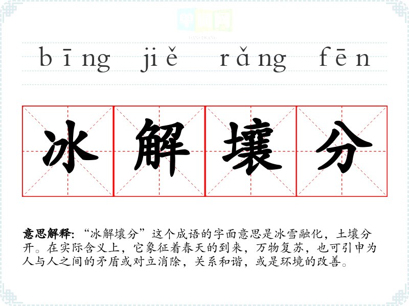 “冰解壤分”这个成语的字面意思是冰雪融化,土壤分开。在实际含义上,它象征着春天的到来,万物复苏,也可引申为人与人之间的矛盾或对立消除,关系和谐,或是环境的改善。