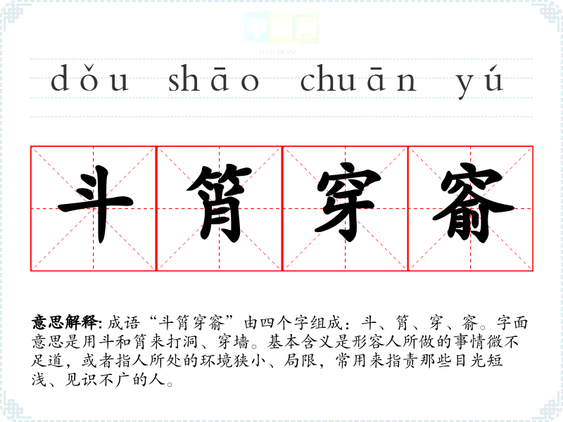 成语“斗筲穿窬”由四个字组成:斗、筲、穿、窬。字面意思是用斗和筲来打洞、穿墙。基本含义是形容人所做的事情微不足道,或者指人所处的环境狭小、局限,常用来指责那些目光短浅、见识不广的人。