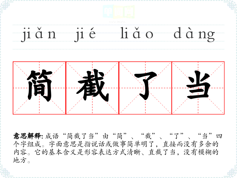 成语“简截了当”由“简”、“截”、“了”、“当”四个字组成。字面意思是指说话或做事简单明了,直接而没有多余的内容。它的基本含义是形容表达方式清晰、直截了当,没有模糊的地方。