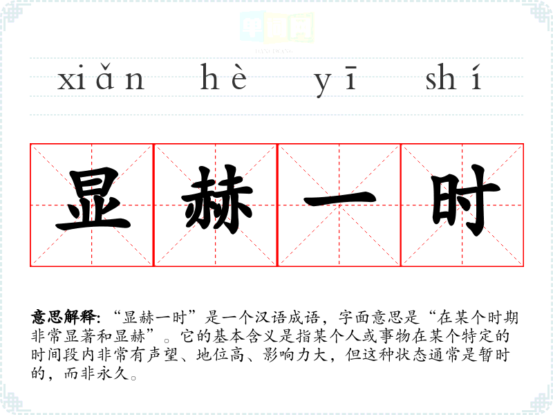 “显赫一时”是一个汉语成语,字面意思是“在某个时期非常显著和显赫”。它的基本含义是指某个人或事物在某个特定的时间段内非常有声望、地位高、影响力大,但这种状态通常是暂时的,而非永久。