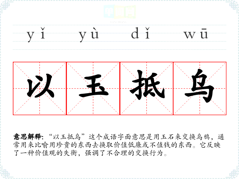 “以玉抵乌”这个成语字面意思是用玉石来交换乌鸦,通常用来比喻用珍贵的东西去换取价值低廉或不值钱的东西。它反映了一种价值观的失衡,强调了不合理的交换行为。