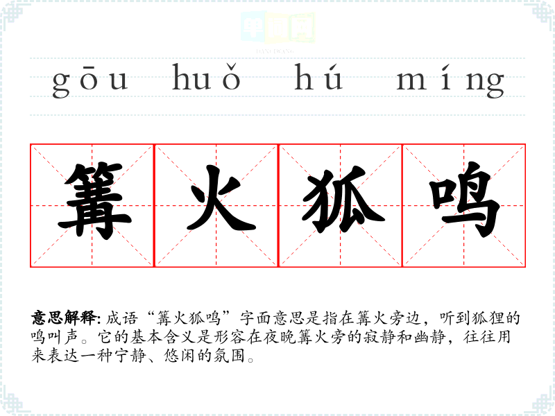 成语“篝火狐鸣”字面意思是指在篝火旁边,听到狐狸的鸣叫声。它的基本含义是形容在夜晚篝火旁的寂静和幽静,往往用来表达一种宁静、悠闲的氛围。