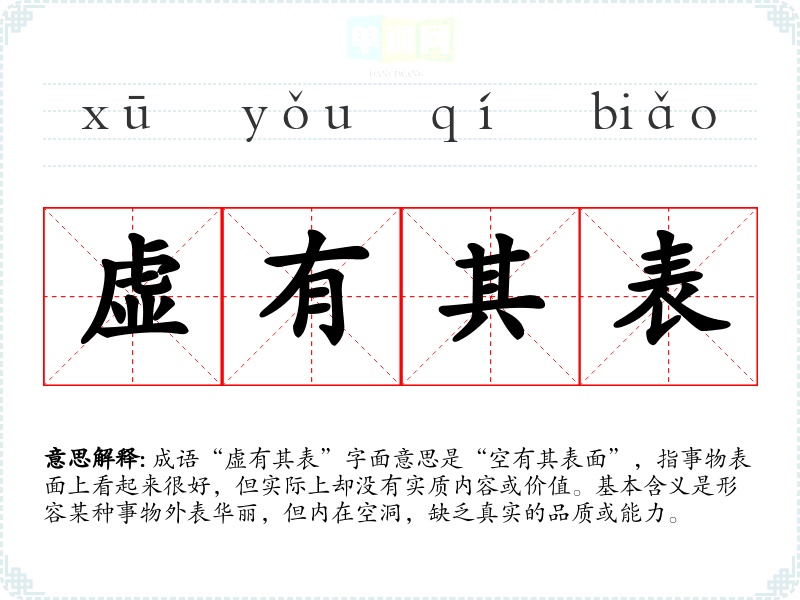 成语“虚有其表”字面意思是“空有其表面”,指事物表面上看起来很好,但实际上却没有实质内容或价值。基本含义是形容某种事物外表华丽,但内在空洞,缺乏真实的品质或能力。