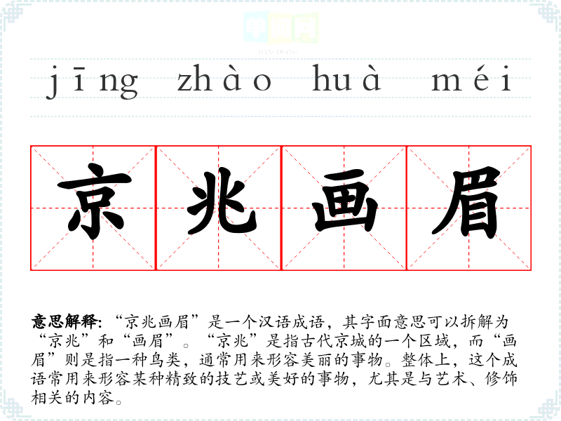 “京兆画眉”是一个汉语成语,其字面意思可以拆解为“京兆”和“画眉”。“京兆”是指古代京城的一个区域,而“画眉”则是指一种鸟类,通常用来形容美丽的事物。整体上,这个成语常用来形容某种精致的技艺或美好的事物,尤其是与艺术、修饰相关的内容。