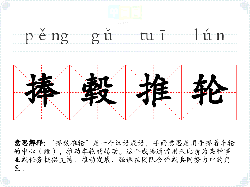 “捧毂推轮”是一个汉语成语,字面意思是用手捧着车轮的中心(毂),推动车轮的转动。这个成语通常用来比喻为某种事业或任务提供支持、推动发展,强调在团队合作或共同努力中的角色。