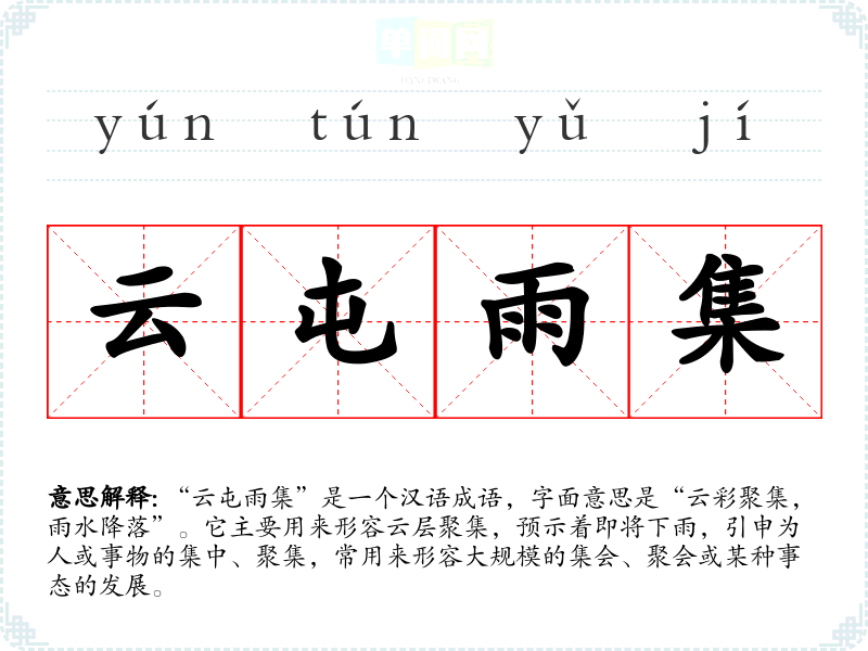 “云屯雨集”是一个汉语成语,字面意思是“云彩聚集,雨水降落”。它主要用来形容云层聚集,预示着即将下雨,引申为人或事物的集中、聚集,常用来形容*的、聚会或某种事态的发展。