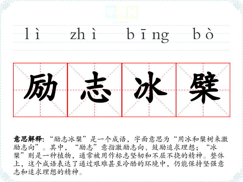 “励志冰檗”是一个成语,字面意思为“用冰和檗树来激励志向”。其中,“励志”意指激励志向、鼓励追求理想;“冰檗”则是一种植物,通常被用作标志坚韧和不屈不挠的精神。整体上,这个成语表达了通过艰难甚至冷酷的环境中,仍能保持坚强意志和追求理想的精神。