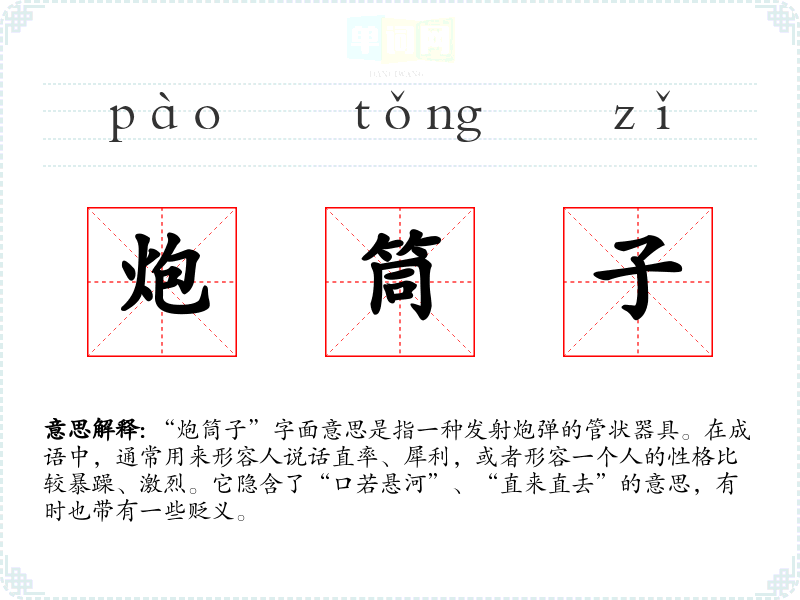 “炮筒子”字面意思是指一种发射炮弹的管状器具。在成语中,通常用来形容人说话直率、犀利,或者形容一个人的性格比较暴躁、激烈。它隐含了“口若悬河”、“直来直去”的意思,有时也带有一些贬义。