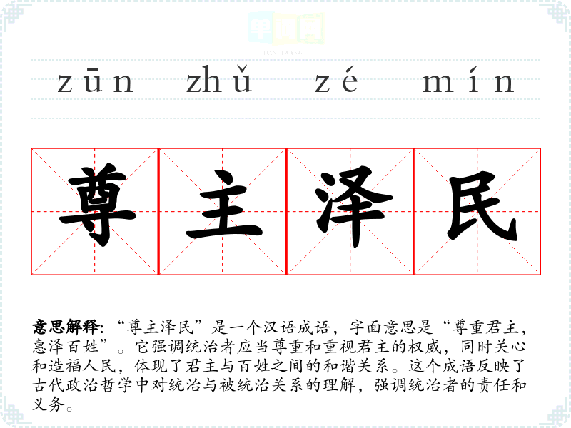 | 尊主泽民 | 尊崇君主,泽惠生民。 |