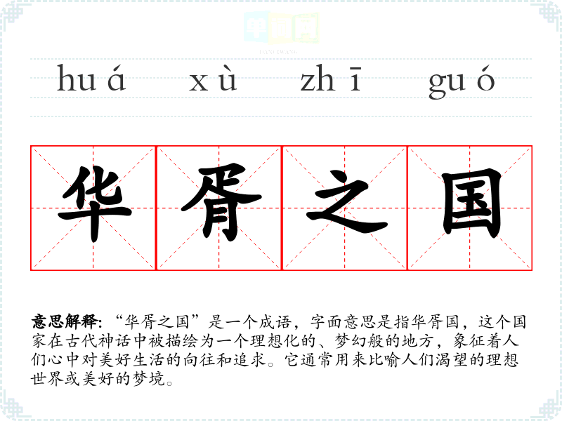 “华胥之国”是一个成语,字面意思是指华胥国,这个国家在古代神话中被描绘为一个理想化的、梦幻般的地方,象征着人们心中对美好生活的向往和追求。它通常用来比喻人们渴望的理想世界或美好的梦境。