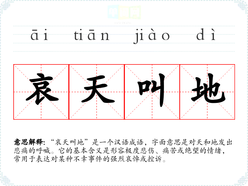 | 哀天叫地 | 哀:悲哀。悲哀地呼天喊地。形容悲痛至极。 |