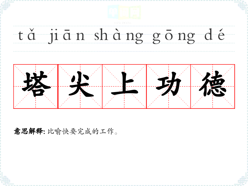 | 塔尖上功德 | 比喻快要完成的工作。 |