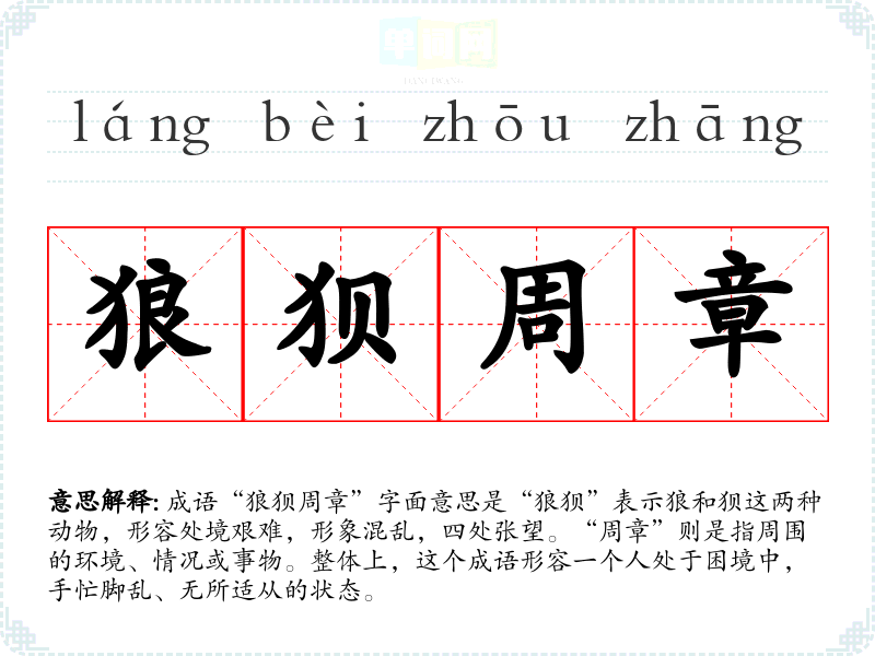 成语“狼狈周章”字面意思是“狼狈”表示狼和狈这两种动物,形容处境艰难,形象混乱,四处张望。“周章”则是指周围的环境、情况或事物。整体上,这个成语形容一个人处于困境中,手忙脚乱、无所适从的状态。
